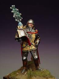 On peut y voir représentés Saint Jean, Saint Pierre et Paul puis à nouveau Saint Jean présentant le chevalier à Jésus et à la Vierge Marie.